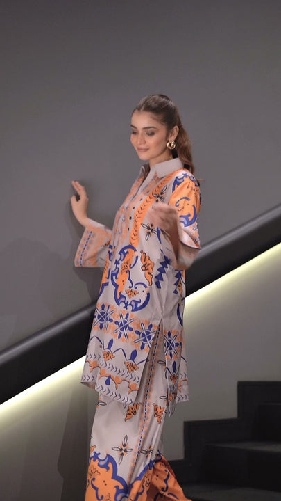 A two-piece coord set paired with wide-leg trousers, featuring digitally printed front and back panels.