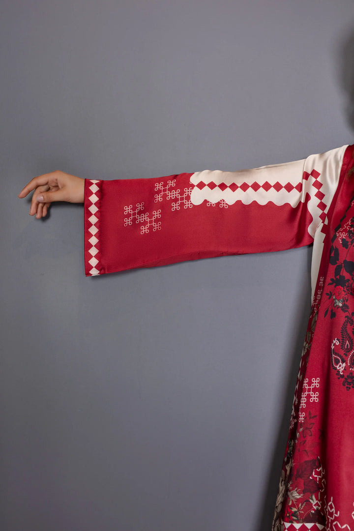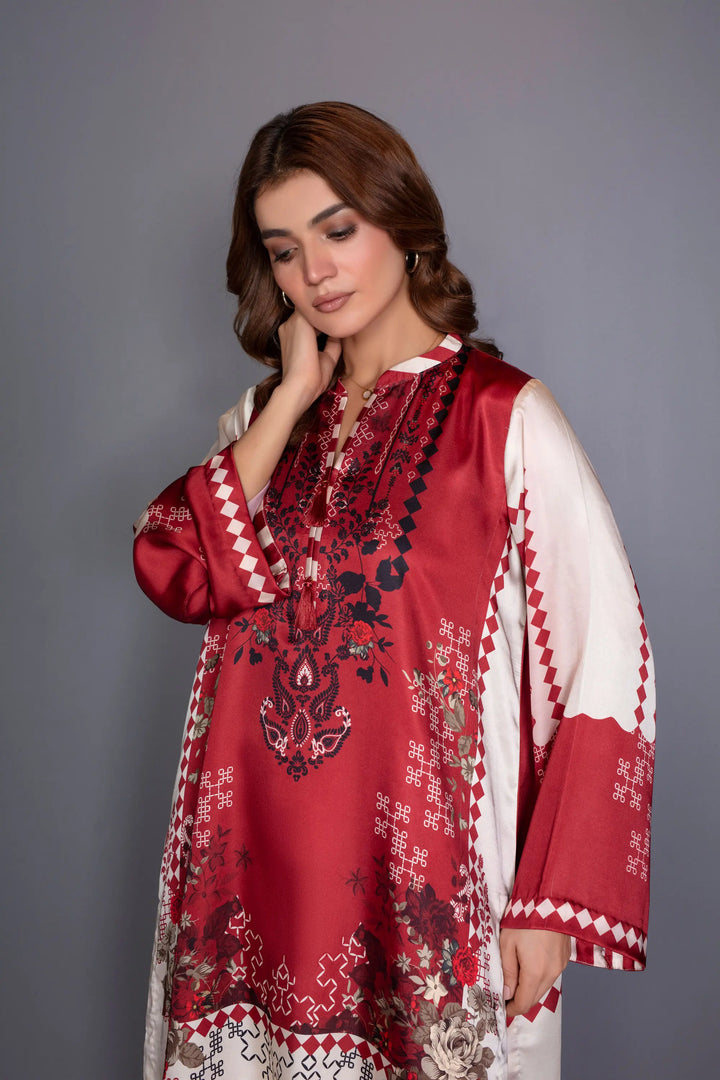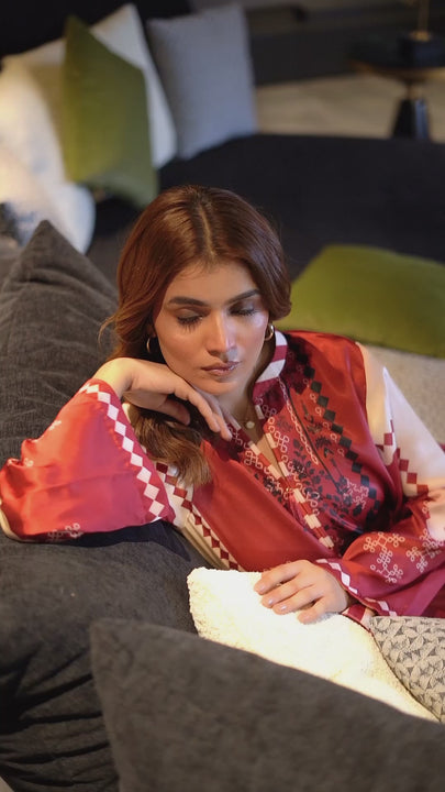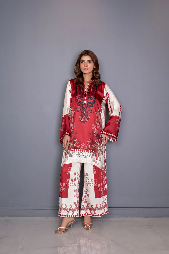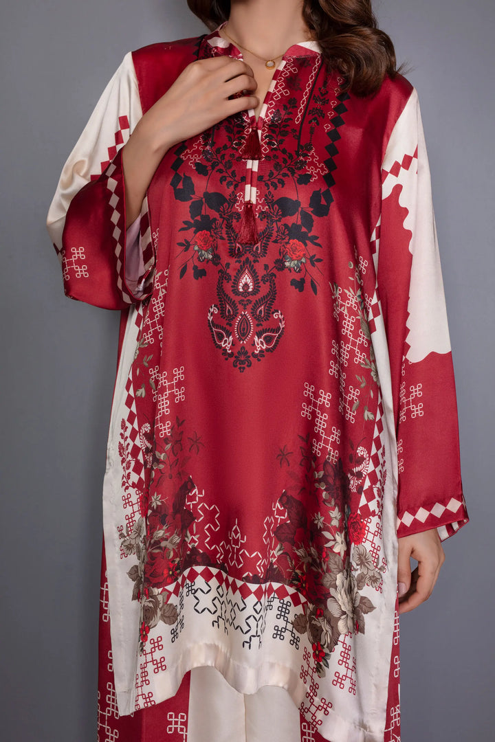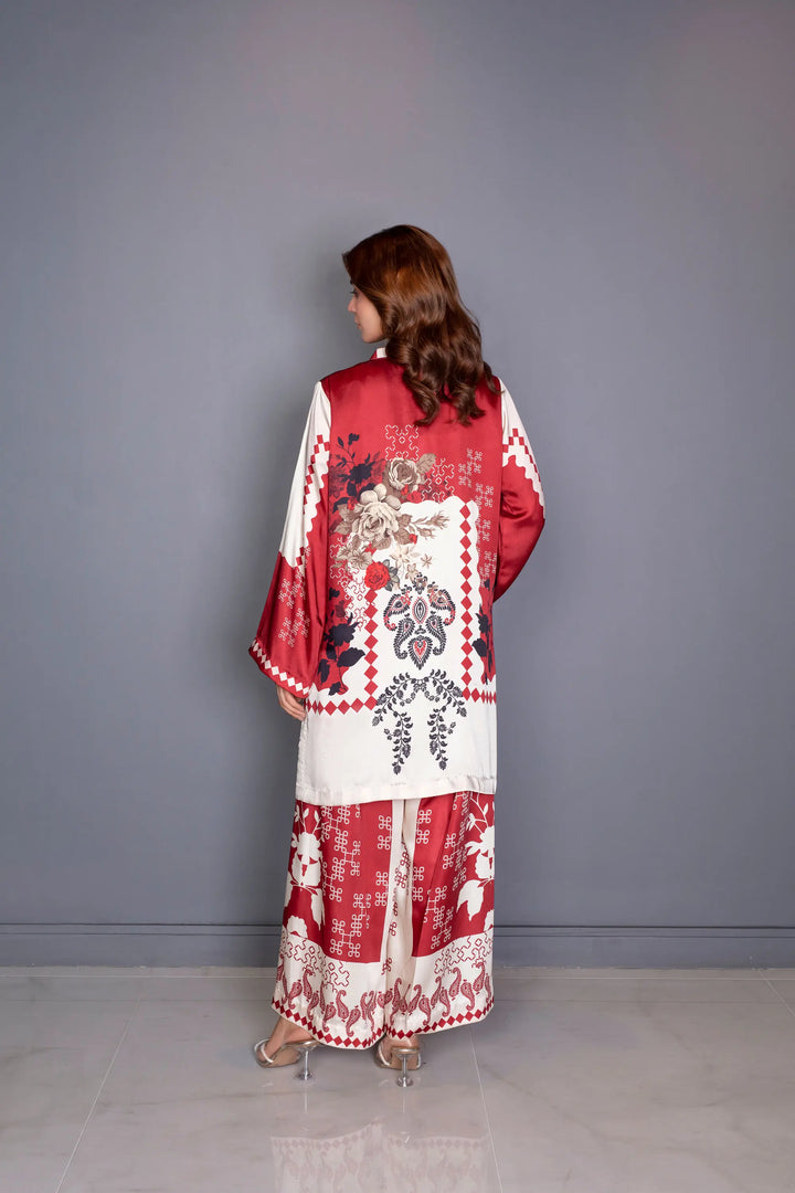 A luxurious silk co-ord set that exudes timeless elegance and modern sophistication. Crafted in premium silk, the set features a rich maroon and ivory palette with intricate artistic motifs that enhance its refined appeal. The top and matching wide-legged trousers offer a sleek balancing structure with graceful movement.