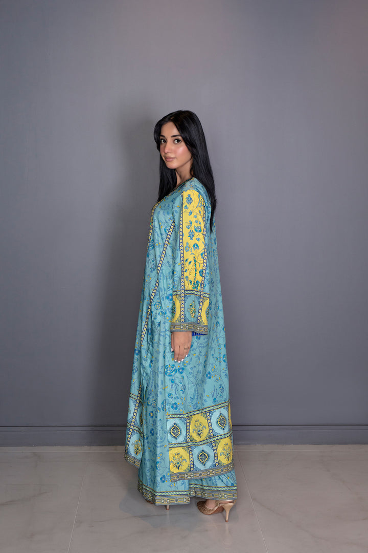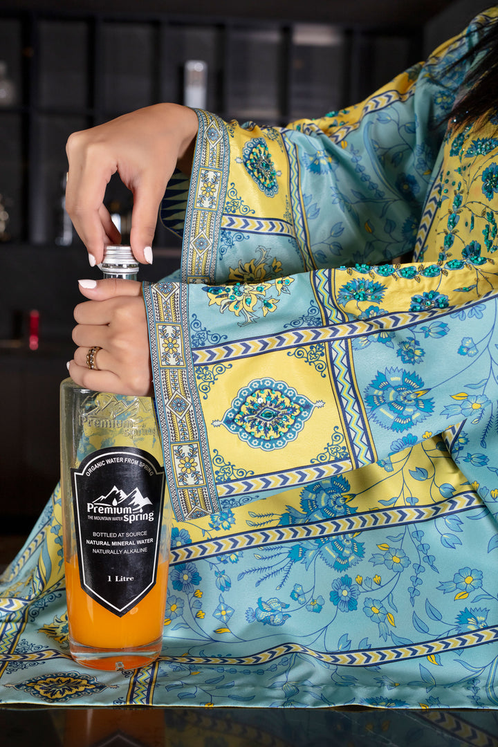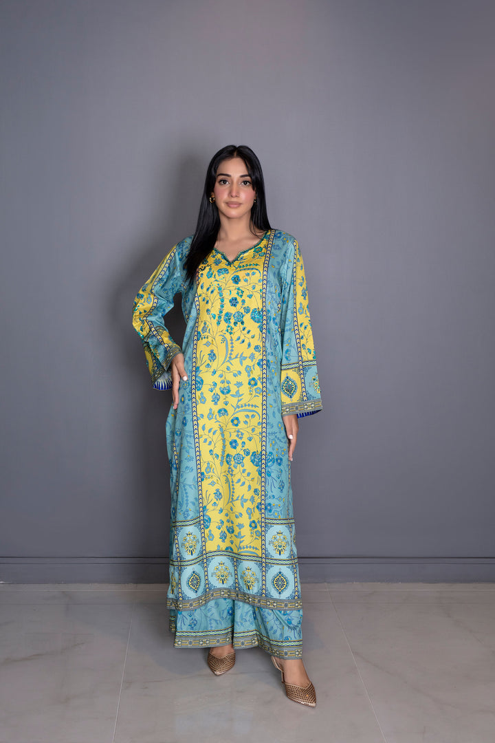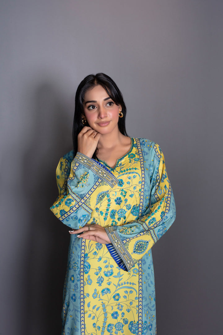 Introducing Mist Blue, a refined long shirt from our Resort Chic Collection, crafted to bring elegance to your wardrobe. Designed with soft botanical-inspired prints, Mist Blue features a refreshing blend of yellow and sky-blue tones, giving it a serene yet vibrant appeal. The front is delicately embroidered with pearls, adding a subtle touch of luxury and elevating its overall charm.