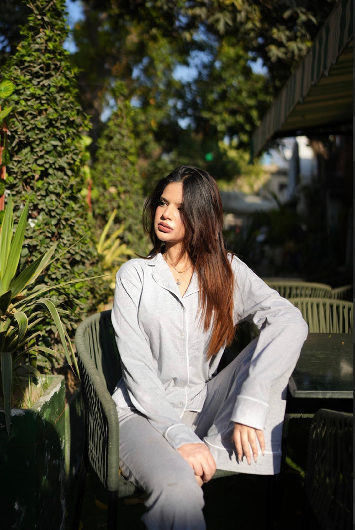 This luxurious sleepwear set is designed for ultimate comfort and effortless style. The full-sleeve jersey fabric button-up shirt, crafted from soft, breathable fabric, offers a classic and comfortable fit. The open-leg, flowy trousers, made from the same luxurious material, create a relaxed and flattering silhouette. The subtle grey color adds a touch of sophistication and elegance, making it the perfect choice for a restful and stylish night's sleep.