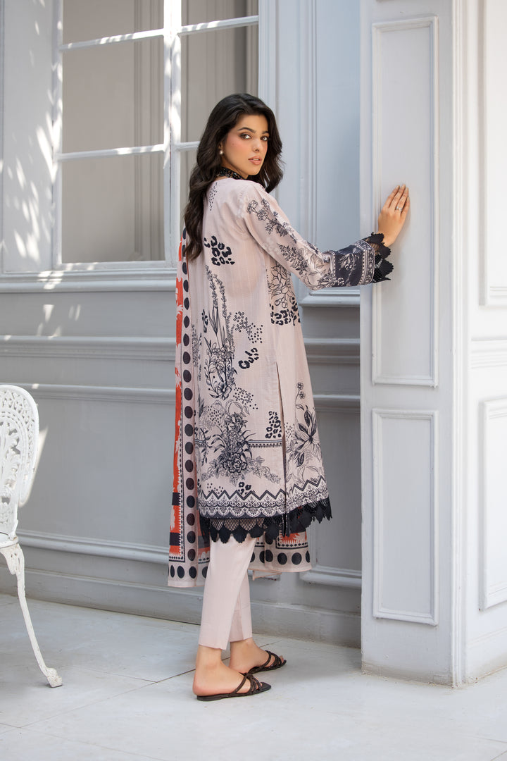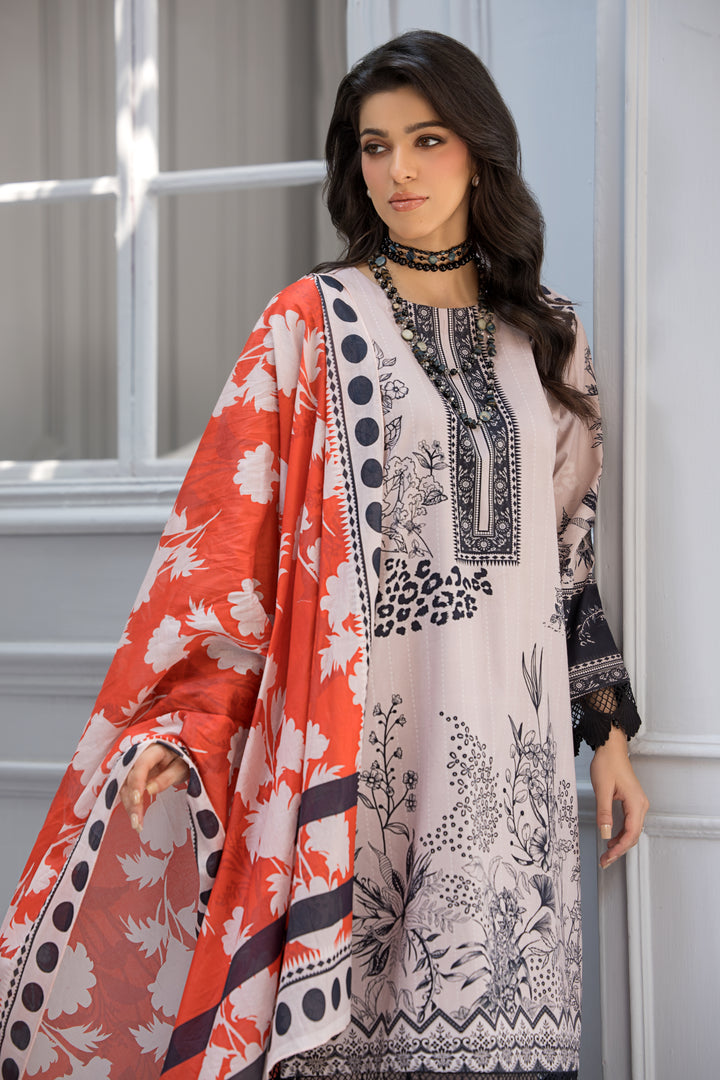 Step into a world of elegance with this enchanting ensemble, featuring a muted tea pink lawn shirt beautifully detailed with delicate black lace accents. Paired with a matching lawn trouser for a seamless flow, the look is brought to life with a vibrant red lawn floral dupatta adding a touch of vibrancy and charm to this timeless tale of style.